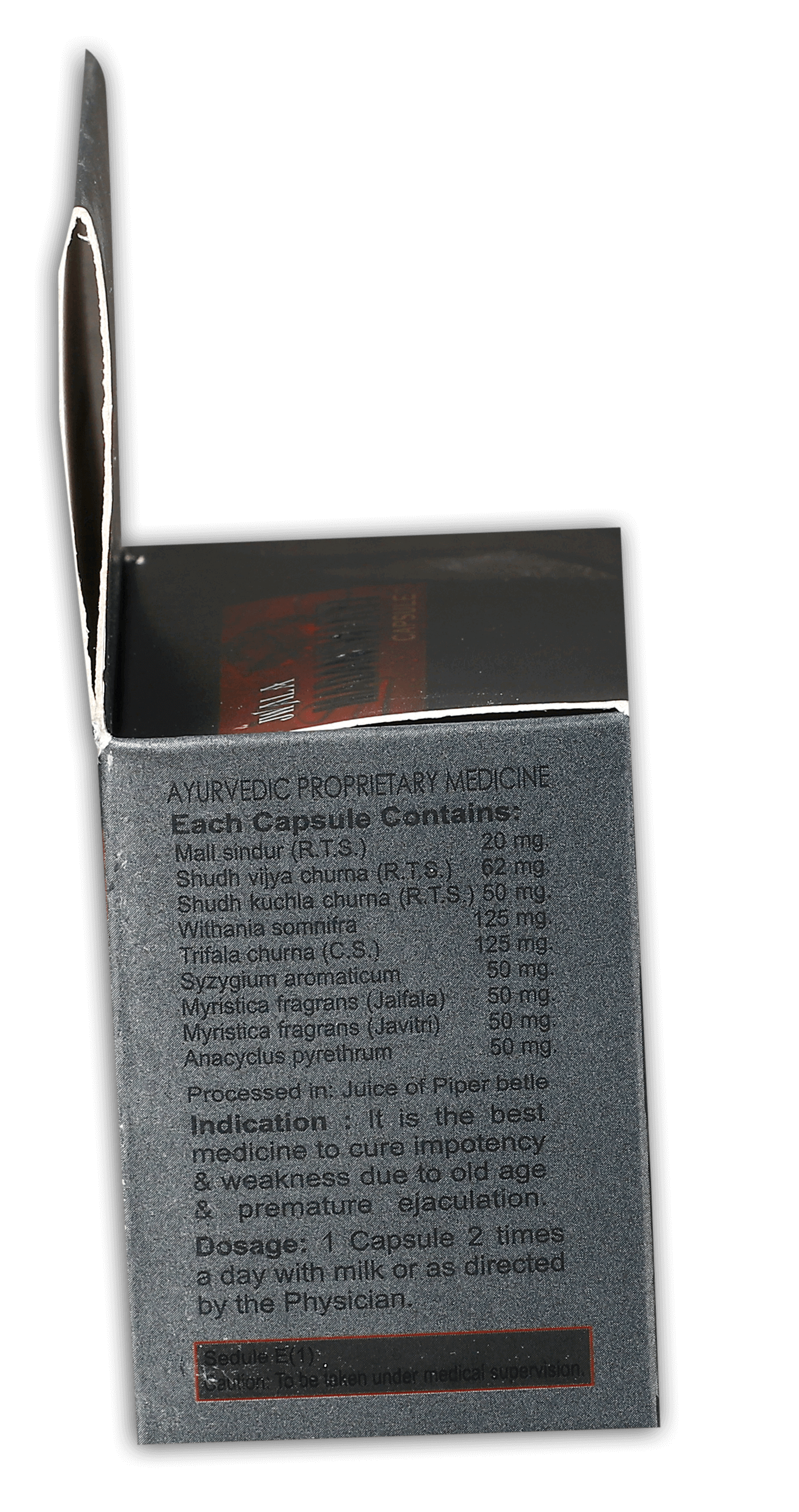 Mall sindur (R.T.S.) 20 mg.Shudh vijya churna (R.T.S.) 62 mg.Shudh kuchla churna (R.T.S.) 50 mg.Withania somnifra 125 mg.Trifala churna (C.S.) 125 mg.Syzygium aromaticum 50 mg.Myristica fragrans (Jaifala) 50 mg.Myristica fragrans (Javitri) 50 mg.Anacyclus pyrethrum 50 mg.